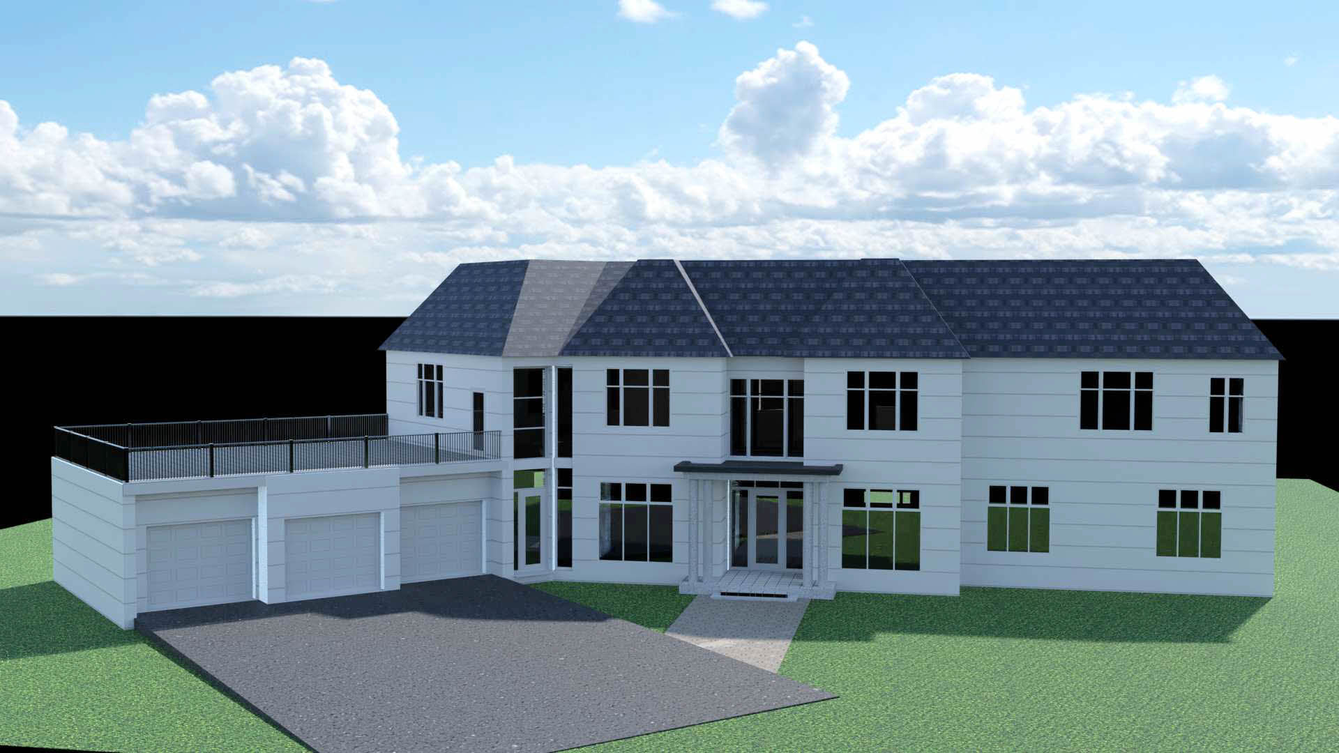 A first, preliminary rendering of a new 6,000 + sq. ft. custom house in Whitchurch-Stuffville, Ontario. This is an interesting project, and we’re excited about the possibilities and challenges presented by this project, which will be a 2nd floor addition to an existing bungaloft home, built in the 1980s. The client wanted a completely new look for their home – a more executive, grand residence – which will also involve extensive renovations to the existing main floor. Should be a fun!!